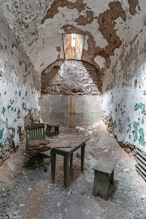 In the middle of a residential neighborhood, sits Eastern State Penitentiary. It fills a whole square block, sitting in a state arrested decay. Having been closed for decades, it towering brick walls stand as a reminder of the harsh conditions it was known for.
